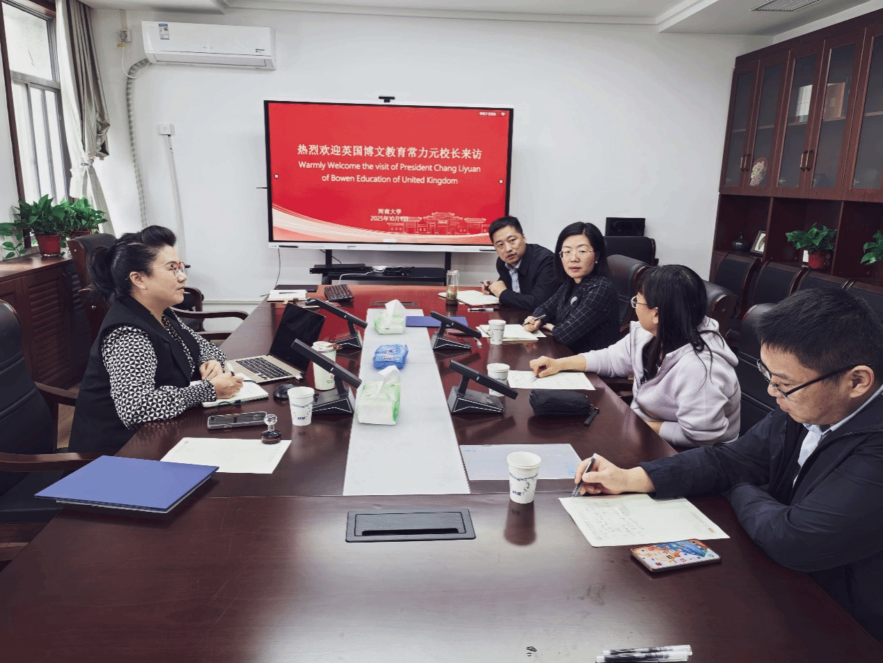 李秋叶代表学校对英国博文教育常力元的到访致以热烈欢迎。她向来宾介绍了河南大学的基本情况。她指出,博文教育与河南大学在国际中文教育等领域的合作交流已经取得喜人成果,期待以此次会谈为契机,进一步扩大双方合作范围,深化合作层次,共同推进河南大学与英国的教育文化交流。