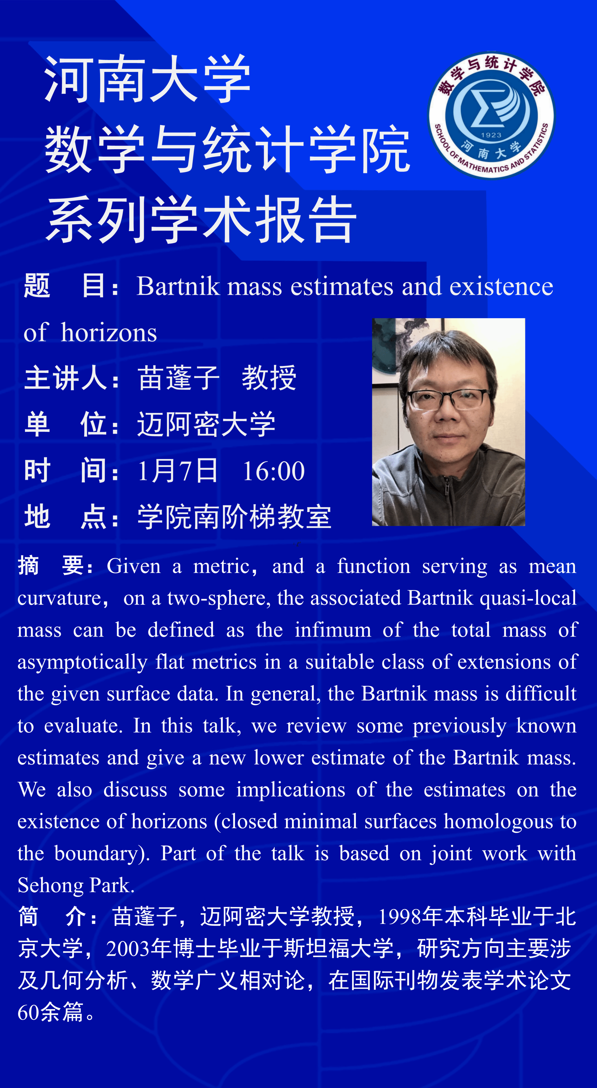 苗蓬子:Bartnik mass estimates and existence of horizons