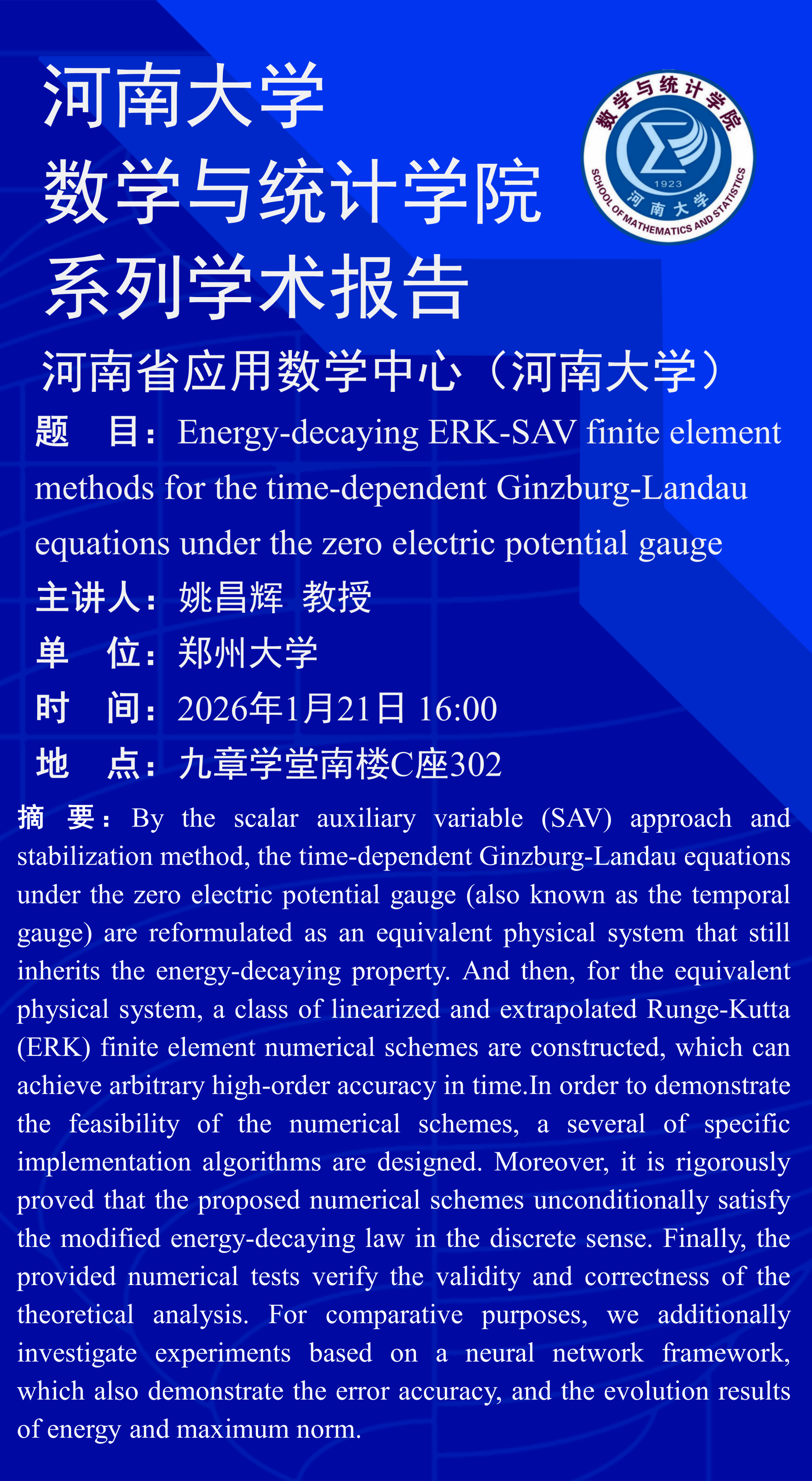 姚昌辉:Energy-decaying ERK-SAV finite element methods for the time-dependent Ginzburg-Landau equations under the zero electric potential gauge