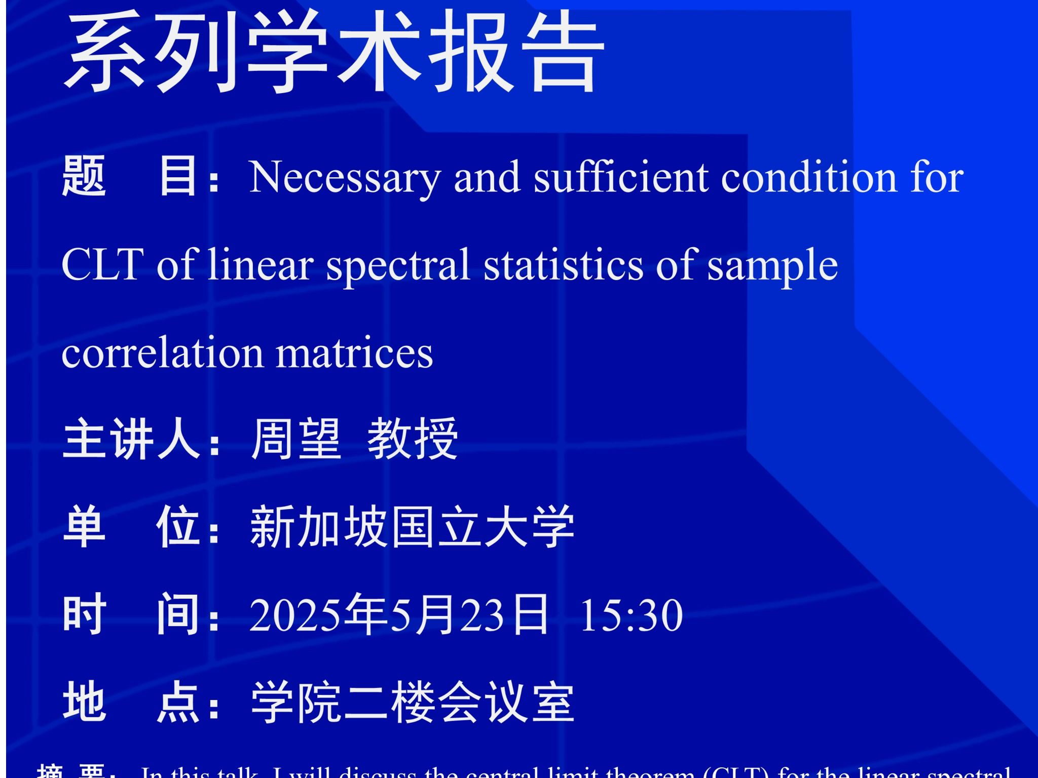 周望:Necessary and sufficient condition for CLT of linear spectral statistics of sample correlation matrices