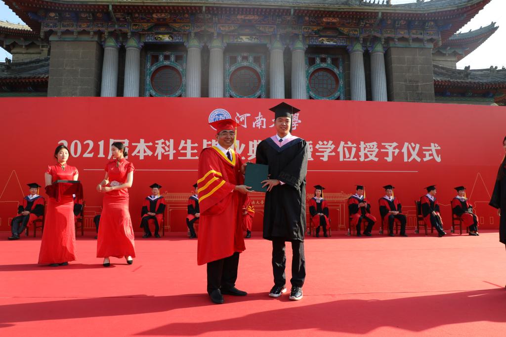 ZHANG Baoming, Deputy Secretary of the Party committee of HENU, read out the "Decision of Henan Provincial Department of Education on commending excellent college and special school graduates in 2021" and "Decision of Henan University on commending excellent graduates in 2021". KAN Yunchao, Vice Chairman of HENU’s Degree Evaluation Committee, read out the "Decision of Henan University Degree Evaluation Committee on awarding Bachelor's degree to undergraduate graduates".
