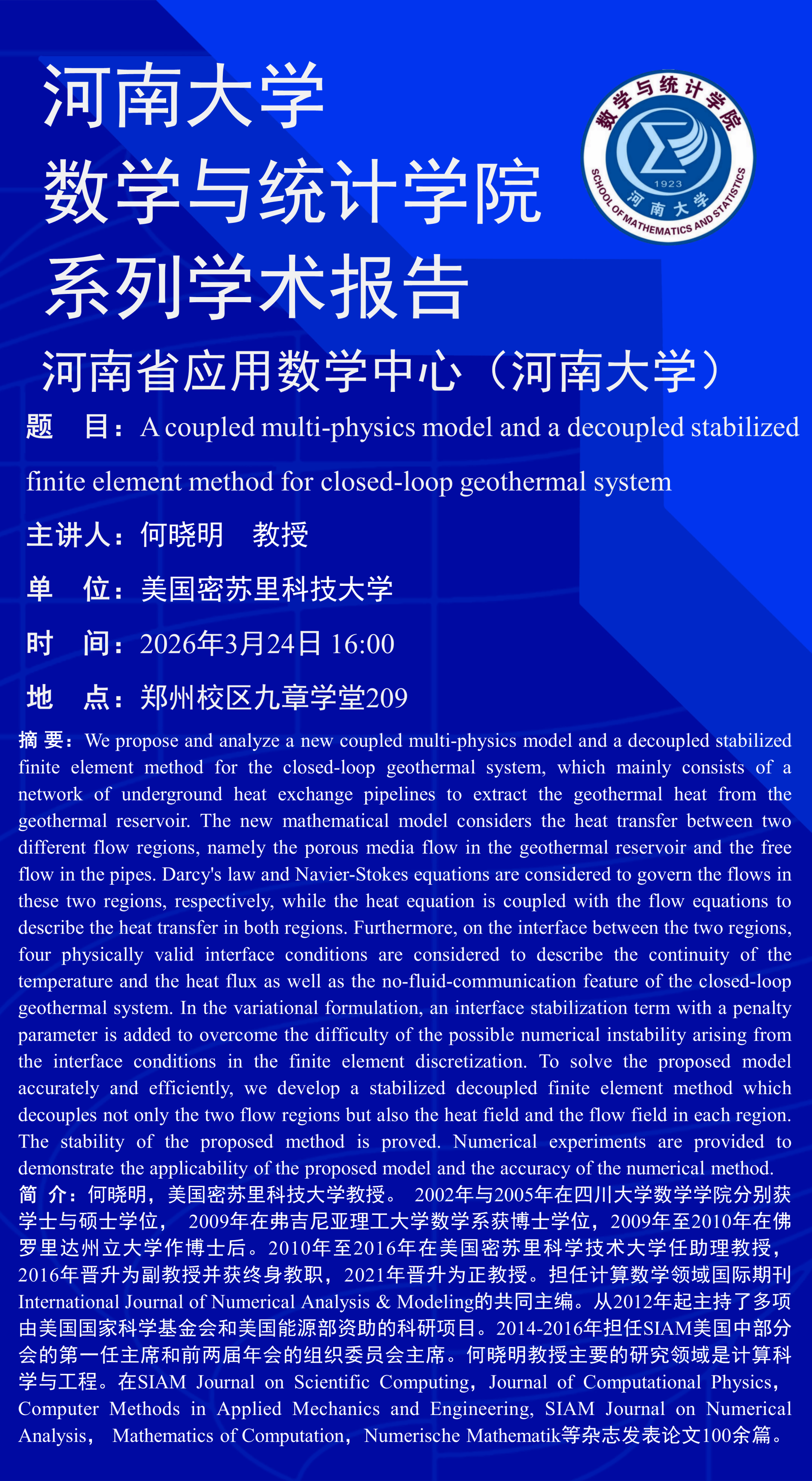 Prof. Xiaoming He:A coupled multi-physics model and a decoupled stabilized finite element method for closed-loop geothermal system