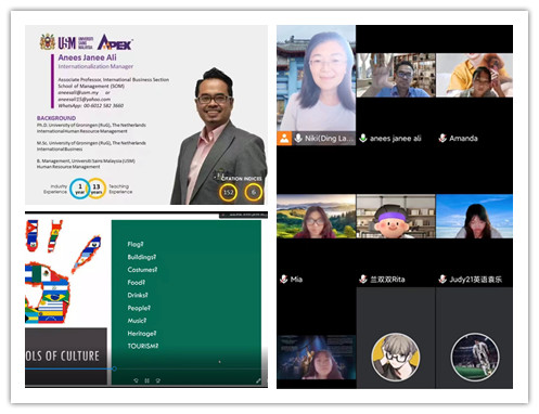 外语学院2022年秋季海外云课堂活动于9月29日启幕,马来西亚理科大学(2022年QS排名第147位)管理学院副教授Anees Janee Ali应邀为学院学子讲授“交流与文化”系列课程。该课程每周线上授课两次4学时,课程共30个学时,预计持续八周时间。“交流与文化”系列课程内容丰富多彩,将重点介绍文化的多样性、影响交际的因素、Hofstede的文化维度理论、跨文化管理、异域广告和交际、跨文化沟通技巧、体态语和文化、公众演讲等。
