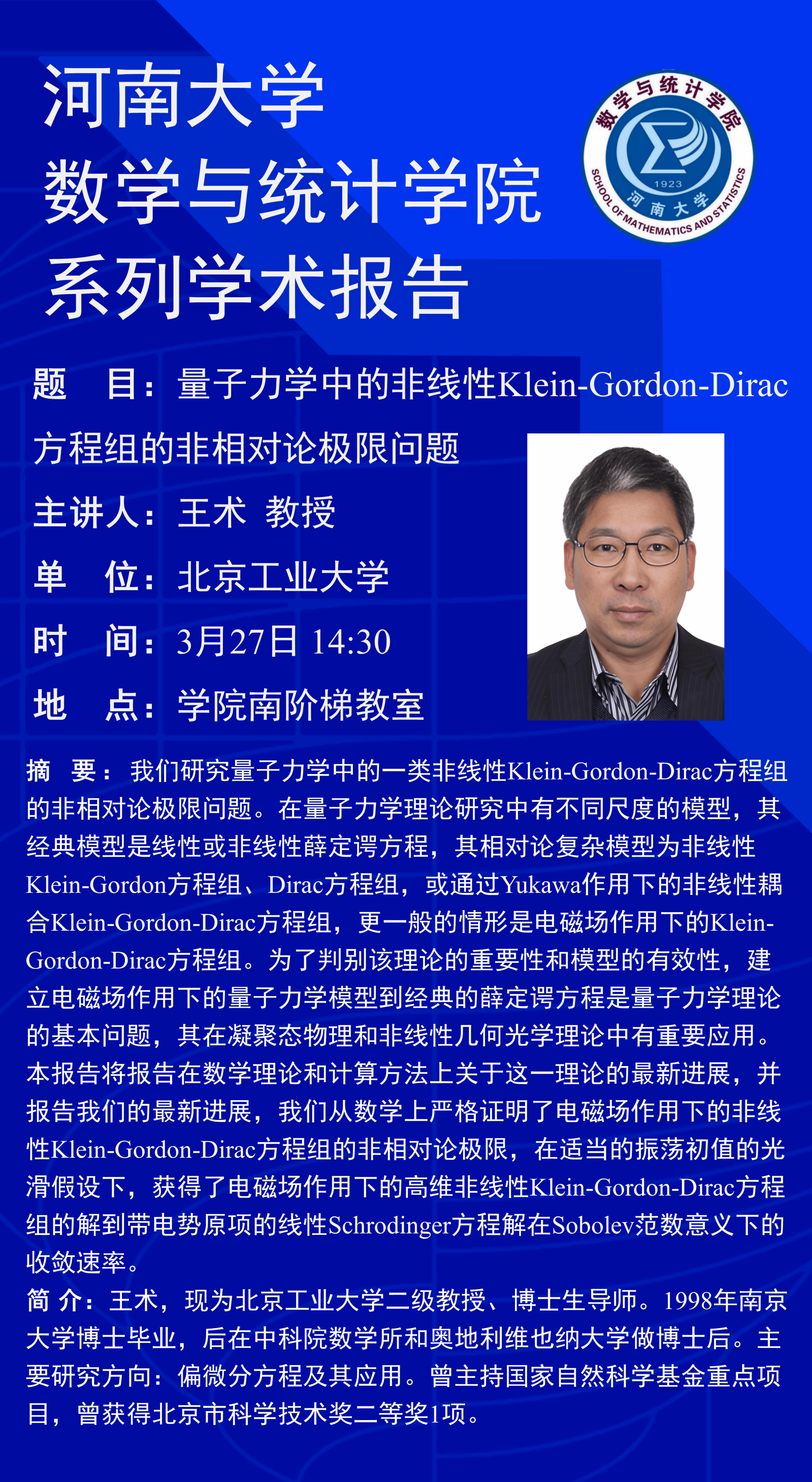 王术:量子力学中的非线性Klein-Gordon-Dirac方程组的非相对论极限问题