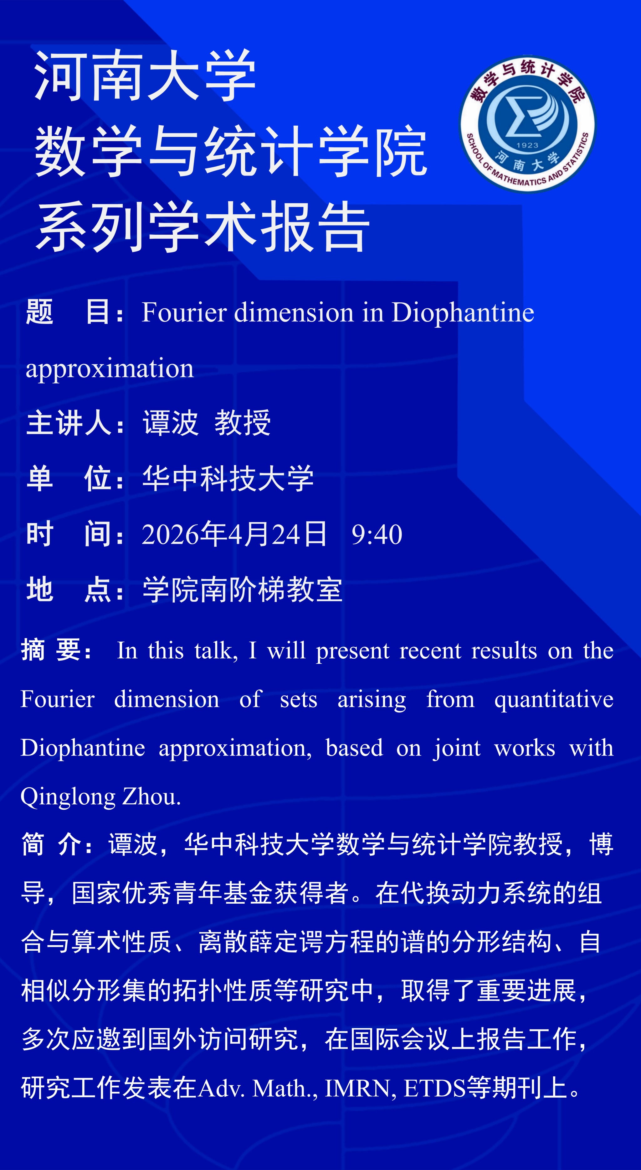 谭波:Fourier dimension in Diophantine approximation(时间:4月24日)