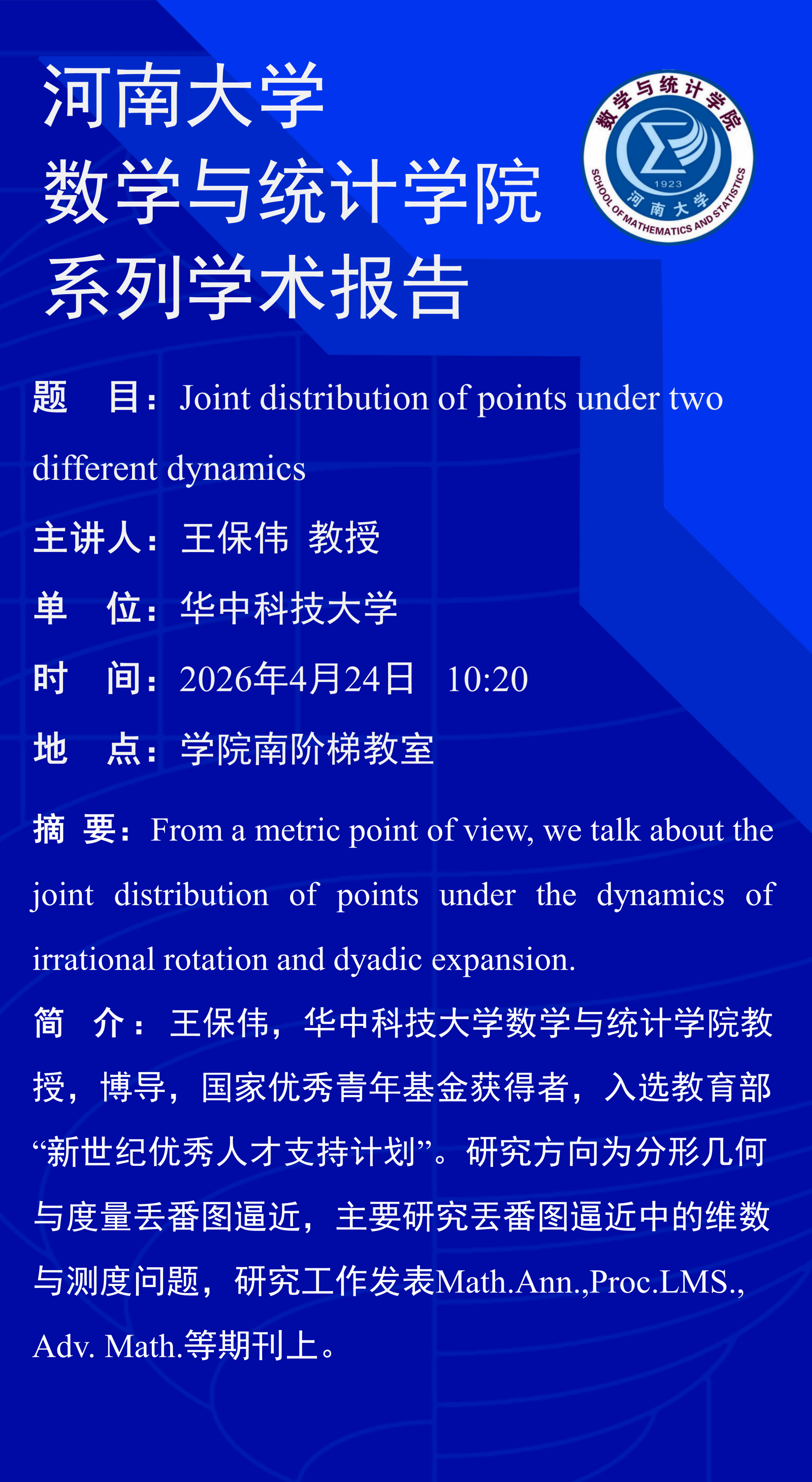 王保伟:Joint distribution of points under two different dynamics(时间:4月24日)