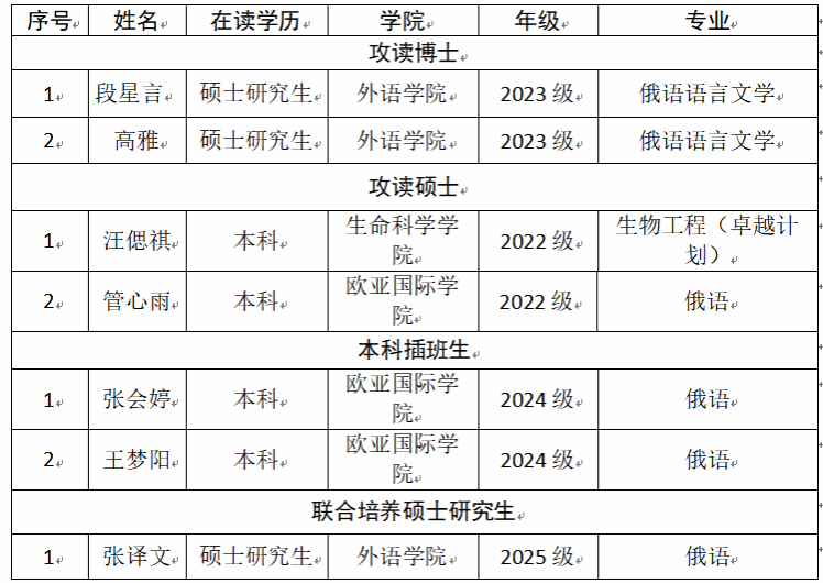 根据国家留学基金管理委员会《关于启动2026年俄罗斯互换奖学金 (中俄政府奖学金)遴选工作的通知》要求,经学生个人申请、学院审核推荐以及学校工作小组审核等流程,现决定推荐我校以下学生申请该项目。