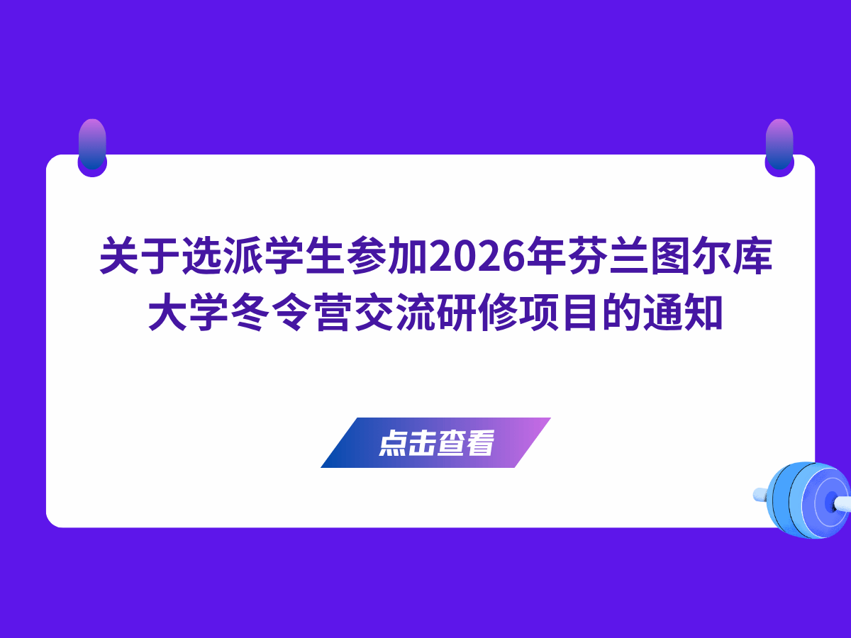 根据我校与芬兰图尔库大学的合作协议,拟选派学生参加2026年芬兰图尔库大学冬令营交流研修项目,现就相关事项通知如下:一、项目简介(一)交流时间:2026年1月25日至2月2日(或因实际情况微调)(二)交流地点:图尔库市、赫尔辛基市(三)选派对象:我校...