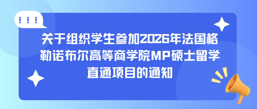 为拓展学生国际视野,提高学生的创新意识、学术及科研能力。根据我校与法国格勒诺布尔高等商学院签署的协议,国际合作与交流处拟组织学生参加2026年法国格勒诺布尔高等商学院MP硕士留学直通项目,现就有关事项通知如下:一、项目信息(一)项目内容该项目...