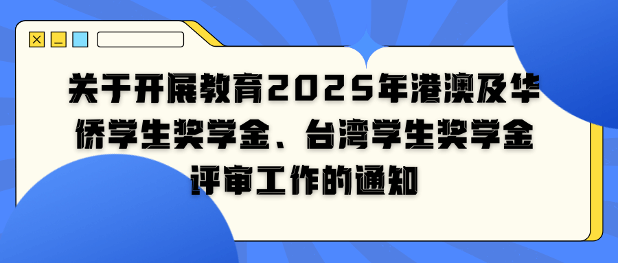 根据教育部《关于做好2025年港澳及华侨学生奖学金台湾学生奖学金评审工作的通知》(教助中心〔2025〕24号)要求,结合财政部、教育部印发的《港澳及华侨学生奖学金管理办法》(财科教〔2017〕139号)和《台湾学生奖学金管理办法》(财科教〔2017〕140号)等文...