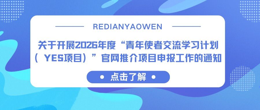 全校各单位:为贯彻落实习近平总书记关于“未来5年邀请5万名美国青少年来华交流学习”和“推动未来3年法国来华留学生突破1万人,欧洲青少年来华交流规模翻一番”的重大倡议,中方发起“青年使者交流学习计划”(Young Envoys Scholarship,以下简称YES项目...