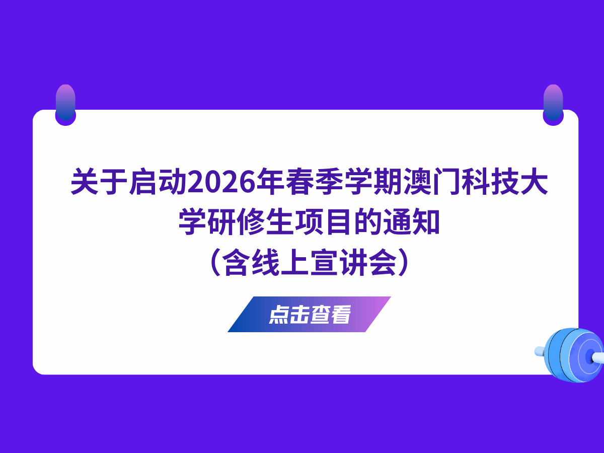 根据我校与澳门科技大学的学生交流协议,2026年春季学期将选派我校优秀学生赴澳门科技大学研修学习,具体信息如下:一、项目概览(一)项目时间:一学期(二)选派年级:派出时为全日制在读二年级及以上本科生、硕士生,毕业年级学生除外(三)选派人数:...
