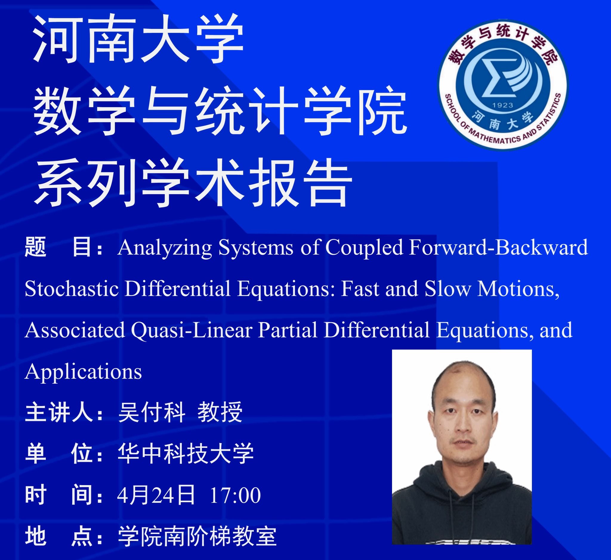 吴付科:Analyzing Systems of Coupled Forward-Backward Stochastic Differential Equations: Fast and Slow Motions, Associated Quasi-Linear Partial Differential Equations, and Applications